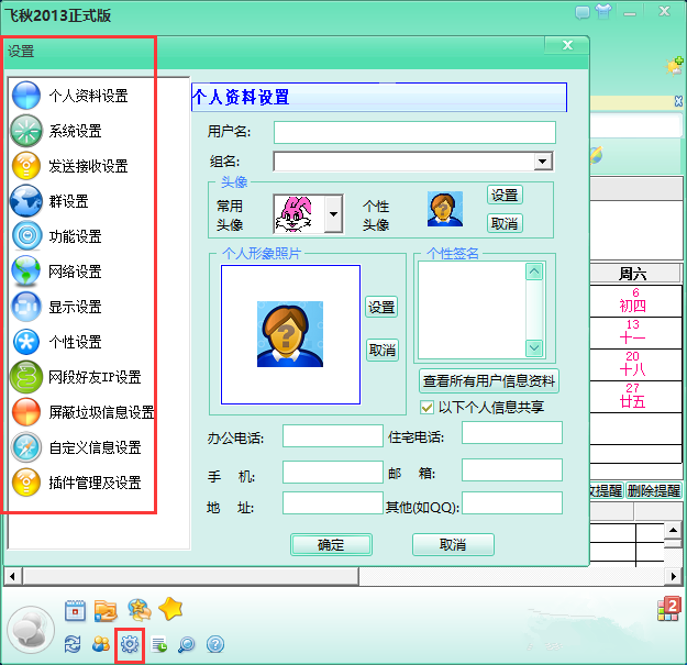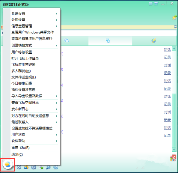 点击左下角的图标,弹出列表,展示了飞秋的一些功能,包括【系统设置】、【外观设置】、【多人群发】等等,