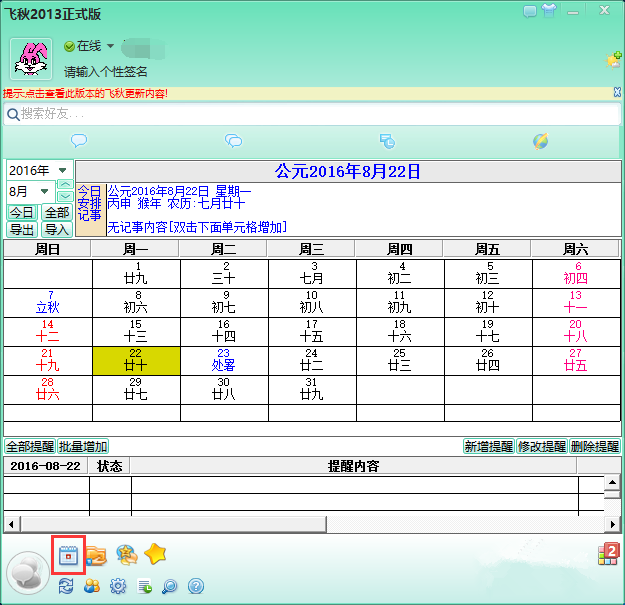 点击下方的日程安排提醒功能,如图,可以显示日历、安排记事,