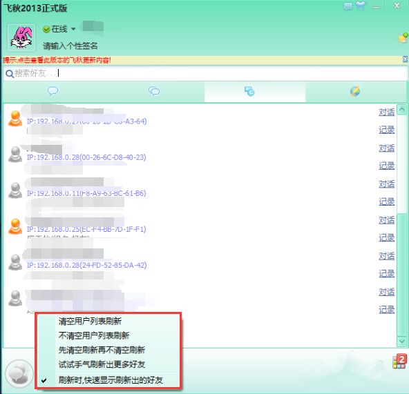 飞秋软件支持刷新功能,可以检测网络是否正常,总体来说,飞秋的表现不比QQ差多少。