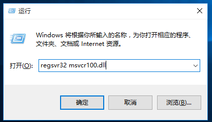 4、按快捷键【Windows+R】,打开运行窗口,输入regsvr32 msvcr100.dll命令,回车,即可解决错误提示。