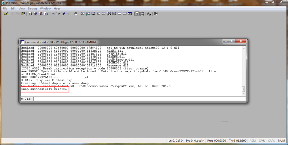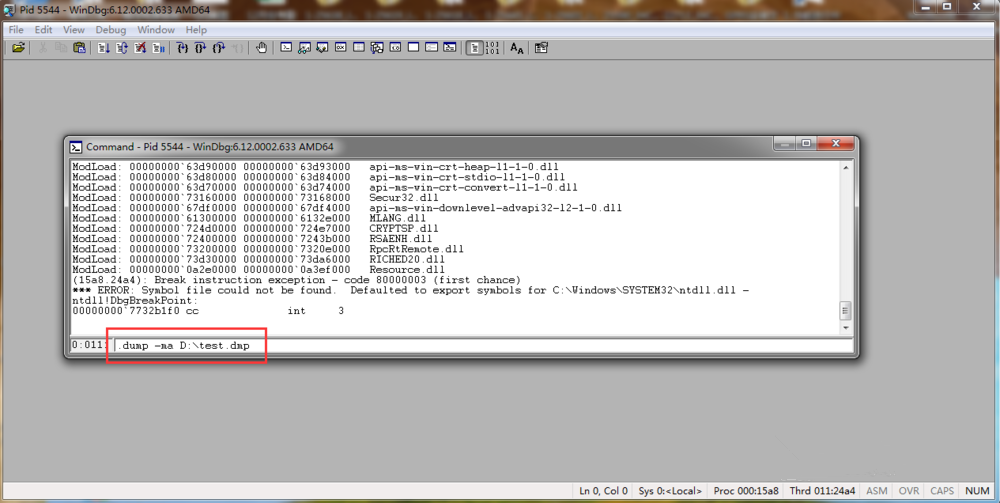 在下方输入.dump –ma E:\\test.dmp,你可以自行更改盘符和文件名,如图,