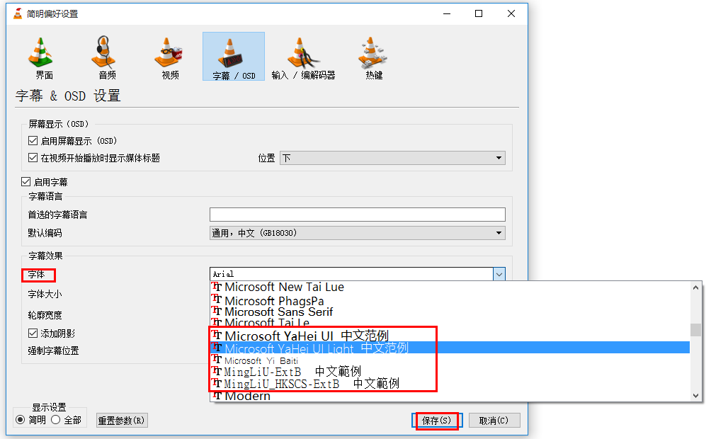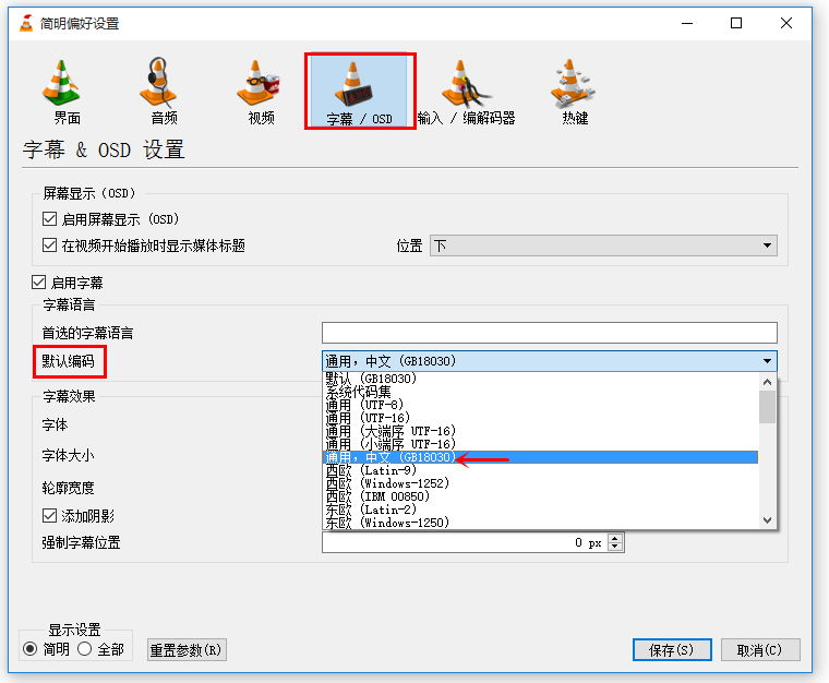 进入简明偏好设置界面,点击切换【字幕/OSD】标签栏,将【默认编码】设置为【通用,中文(GB18030)】,如图,