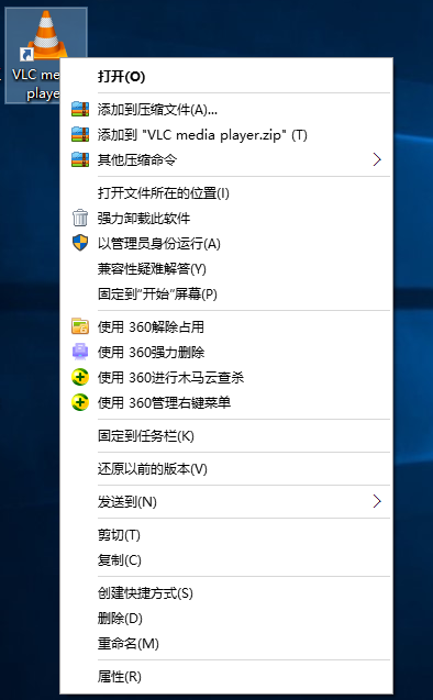 找到VLC media player软件图标,鼠标右击,弹出菜单,选择【属性】,