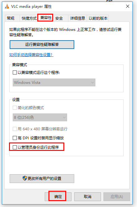 打开VLC media player属性窗口,如图,点击切换【兼容性】一栏,勾选【以管理员身份运行此程序】,点击确定,再次打开VLC播放器,加载该视频,就不会出现“重建字体缓存”提示。