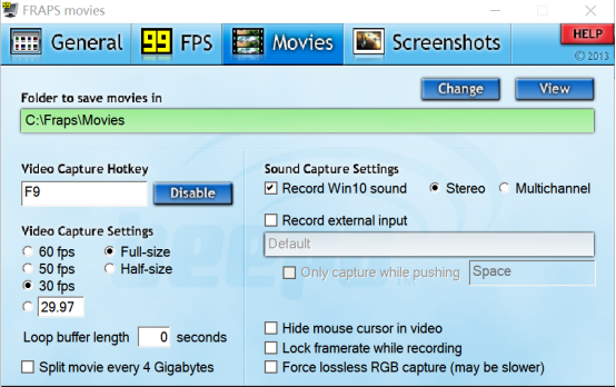 3、在软件界面点击“Movies”,可以更改录像的存储位置、快捷键、帧数等,还可以选择视频是否录入声音,如下图: