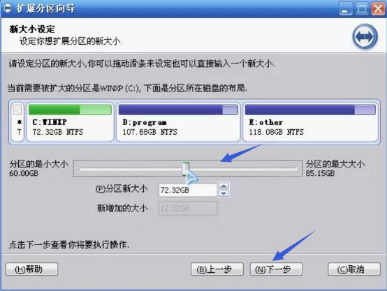 5、到了这一步操作,用户可以通过拖动滑块条来重新设置C盘的大小。设置完成后,点击“下一步”进入确定执行页。