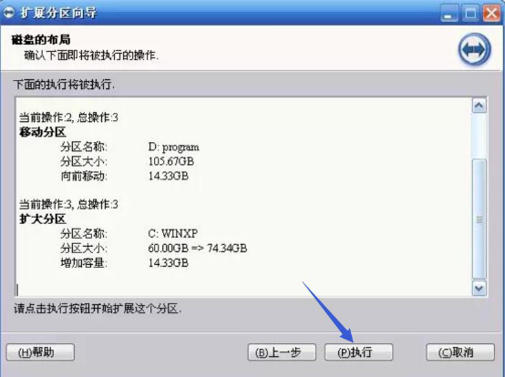 6、在执行页窗口中,可以看到C盘的扩大空间和总空间大小。点击“执行”按钮后,分区助手便真正开始执行扩大C盘。