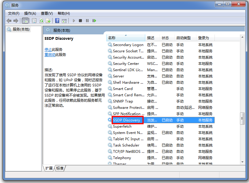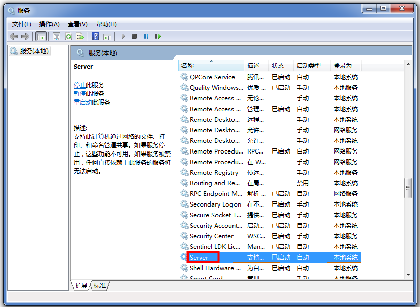 进入服务管理界面,如图,找到Server和SSDP Discovery服务,查看是否被禁用,如果被禁用,可以右键启用,