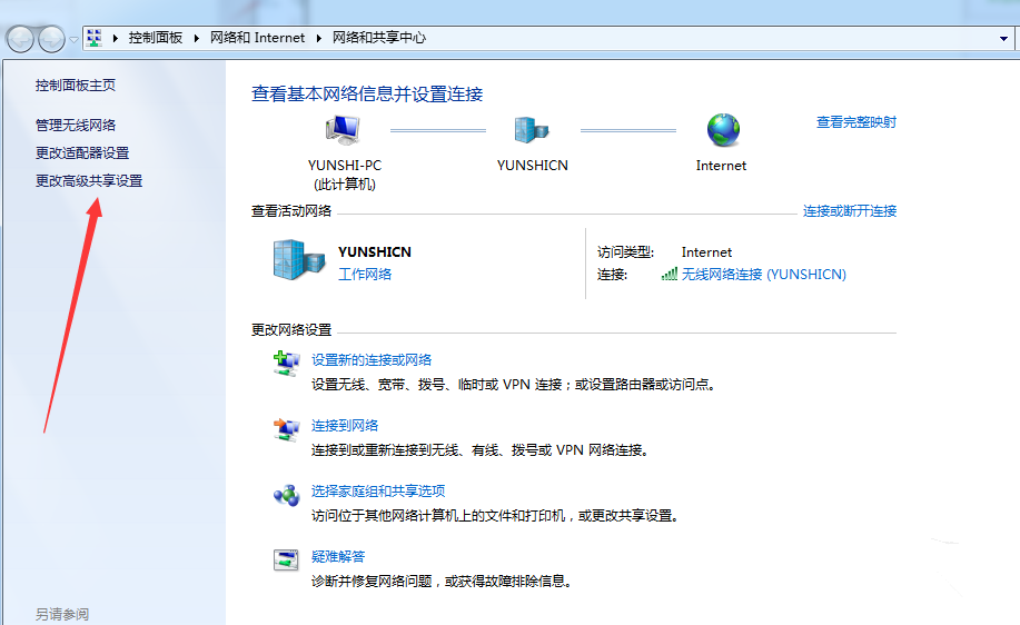 如果电脑设备处于同一局域网,仍然无法连接共享打印机,那就需要检查高级网络。打开控制面板,点击【网络和共享中心】,进入以下界面,点击左侧的【更改高级共享设置】,