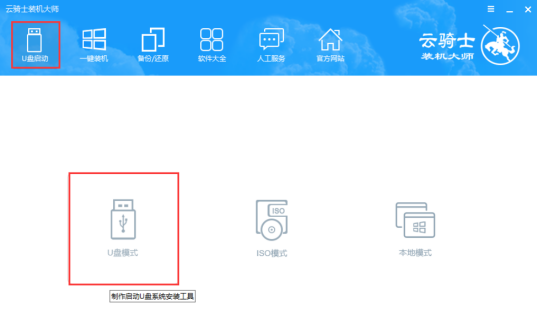 1、打开电脑上安装的“云骑士”软件,点击“U盘启动”,选择“U盘模式”,如下图: