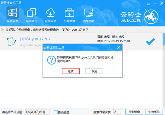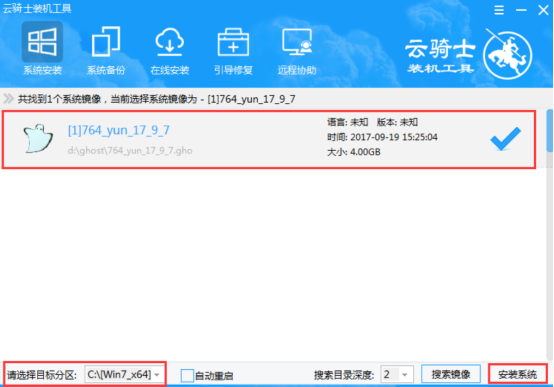 3、打开桌面的“云骑士安装工具”,勾选需要安装的系统,将系统安装到C盘,然后点击“安装系统”,如下图: