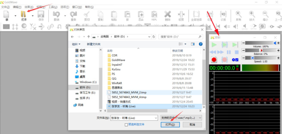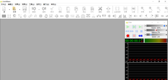 2、在goldwave的主界面功能菜单栏,用户点击“打开”选择需要剪辑的音乐文件。同时,可以发现在主界面的右侧,有音乐的控制器,可以用来播放和暂停音乐,满足用户在剪辑中进行试播的需求。