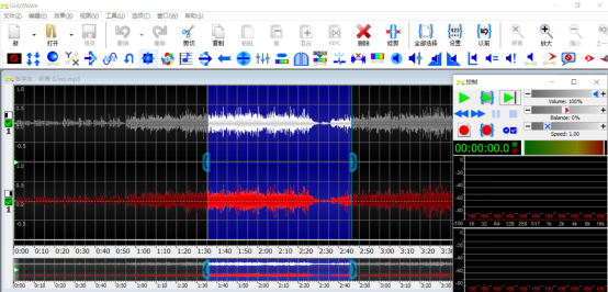 3、怎么用goldwave剪辑一部分的音乐?用户要先选取所需剪辑的音乐部分。在选取过程中,可以调整音乐播放的时间轴来调整具体区域。如下图的蓝色部分便是所选定的音乐部分。