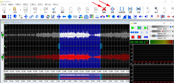 4、如果用户只想保存所选取的部分,那可以直接点击goldwave界面功能栏的“修剪”即可剪辑;如果用户想讲所选取的部分删除,那么就点击“删除”即可一键删除。