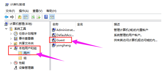 进入计算机管理界面,在左侧点击展开【本地用户和组】,选择【用户】,双击Guest,如图,