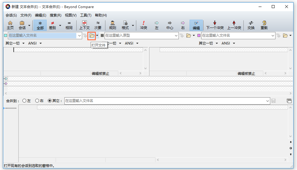 1、打开Beyond Compare,进入主页,点击【文本合并】功能,弹出对话框,如图,点击第一个【打开文件】按钮,