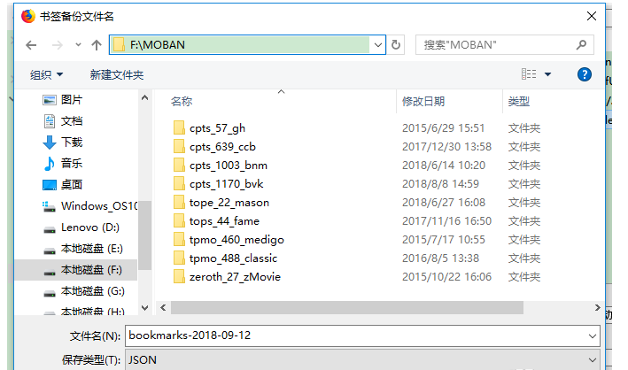 然后点击【导入和备份】——【备份】,弹出对话框,设置备份文件名称、保存类型、保存路径,备份文件名是.json,路径为F:\\MOBAN,