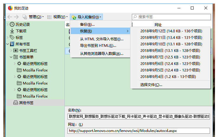 打开新的火狐浏览器,还是按照原来的步骤进行操作,如图,点击【导入和备份】——【恢复】,搜索书签,即可实现恢复。