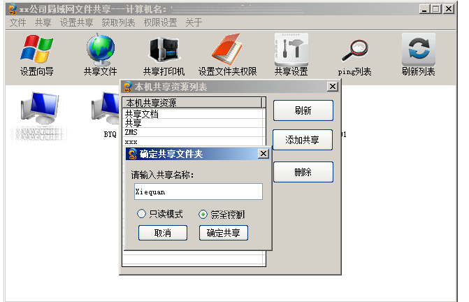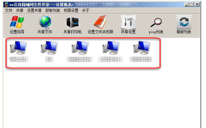 打开xp/win7局域网共享软件,进入主界面,软件内容区域会显示当前局域网内已经设置共享的电脑,如图,