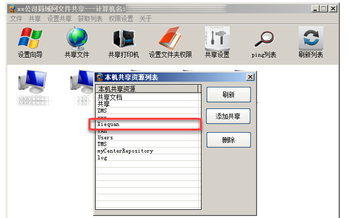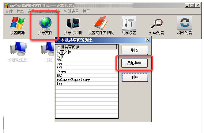 在工具栏中点击【共享文件】,打开本机共享资源列表,在窗口中点击【添加共享】按钮,