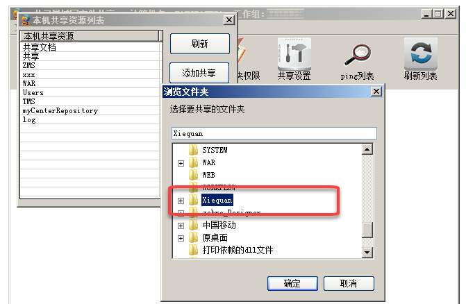 弹出对话框,查找并选择需要共享的文件夹,点击【确定】,然后在【确定共享文件夹】窗口中设置共享名称以及权限,如图,
