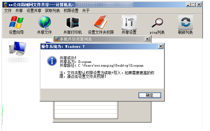 点击【确定共享】按钮,提示共享成功,如果需要修改文件夹权限,可以点击工具栏中的【设置文件夹权限】,