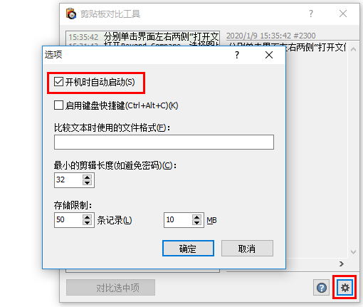 点击【选项】图标,打开面板,勾选【开机时自动启动】,即可快速进行剪贴板对比。