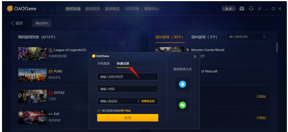 下载安装QAQGame游戏加速器,打开软件,进入界面,首先需要注册账号,你可以使用手机号进行注册,也可以通过微信号、QQ号进行登录(需绑定手机号),