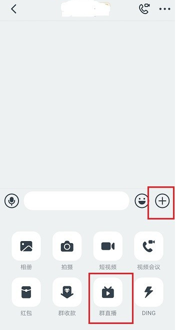 1、在手机中打开钉钉APP,进入界面,随意点击一个钉钉群聊,在聊天窗口点击【+】,选择【群直播】功能,