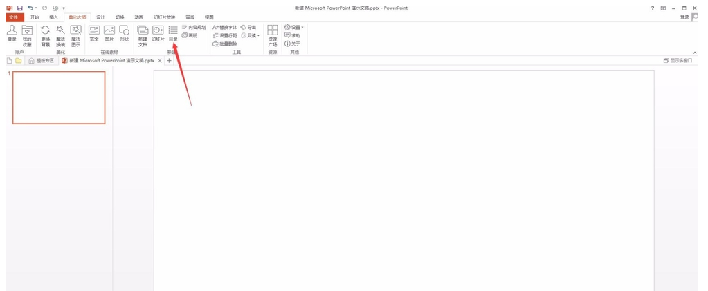 从本站下载安装PPT美化大师,新建一个PPT演示文稿,如图,你会在上方菜单栏中看到“美化大师”这一插件,
