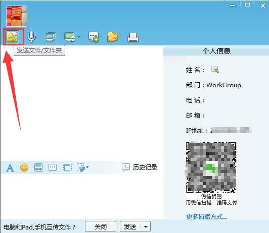 3、然后,在飞鸽传书软件的聊天窗口中,点击左上角的“发送文件/文件夹”。此时,飞鸽传书软件会弹出选择文件的窗口,用户即选择要传输的文件。