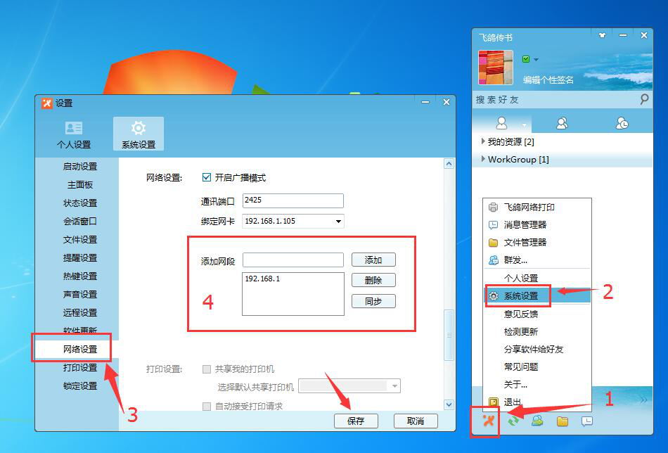 6、如果用户需要手机电脑利用飞鸽传书软件来实现文件传输。那么就要在飞鸽传书的电脑端,点击“系统设置”,在系统设置中选择“网络设置”。手机和电脑连接同一个无线网络,并将网段设置成一样就可以实现文件传输了。