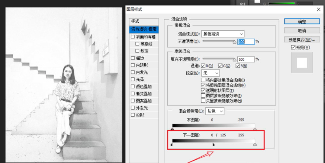 弹出新窗口,如图,按住Alt键,然后拖动【下一图层】至125,点击确定,