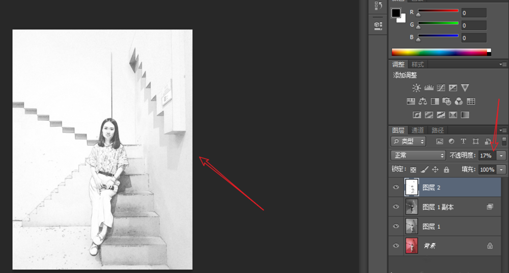 选择【图层2】,点击【不透明度】,设置为17%,即可成功将照片转为素描风格,效果如图。