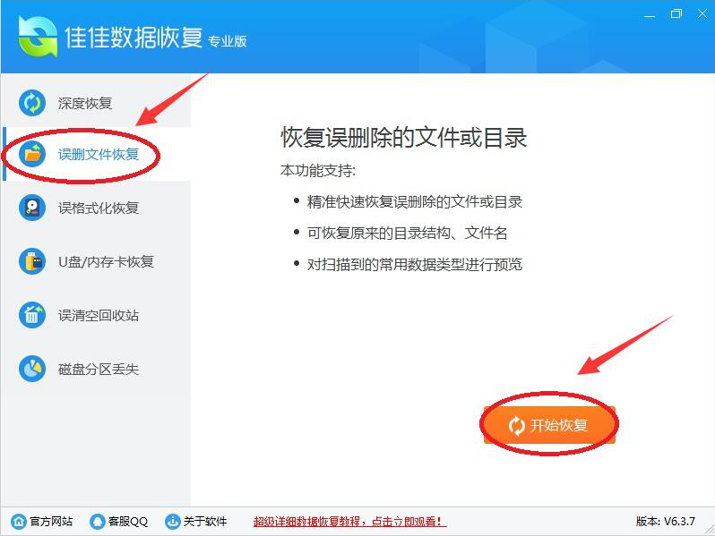1、打开佳佳数据恢复软件,在其界面的左方功能栏中,点选“误删文件恢复”,并点击界面右下方的“开始恢复”。