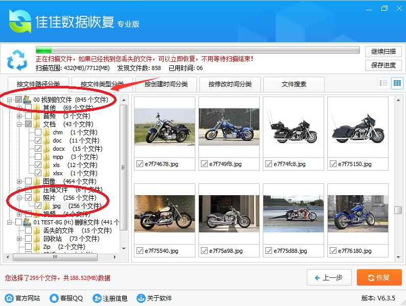8、佳佳数据恢复软件还有一个非常人性化的地方,就是当该软件找到的文件太多时,用户为了快速找到文件,可以点击“按文件类型分类”、“按创建时间分类”、“按修改时间分类”、“文件搜索”来查找自己删除的文件。