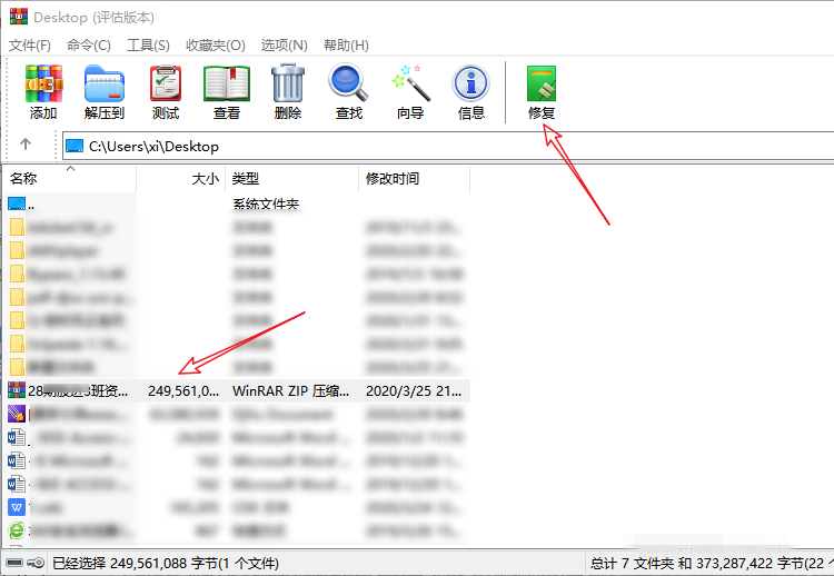 运行WinRAR软件,如图,找到刚才下载的压缩包文件,选中它,点击上方【修复】按钮,