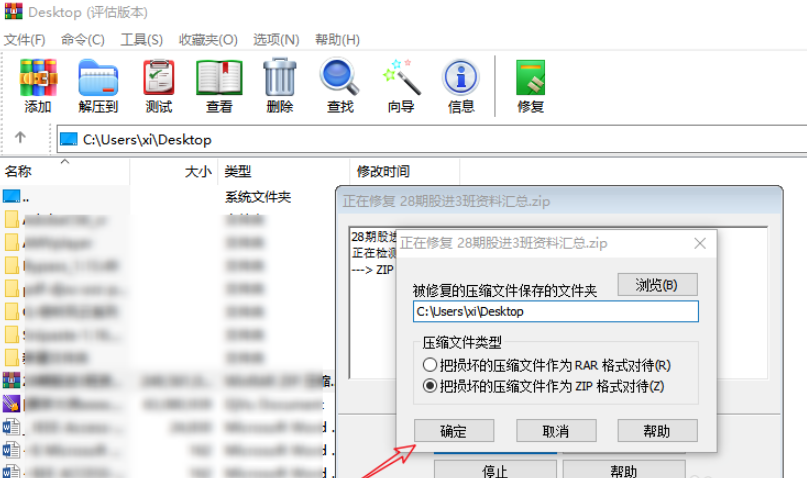 弹出对话框,如图,对被修复的压缩文件进行设置,选择文件保存路径和文件类型,然后点击确定,