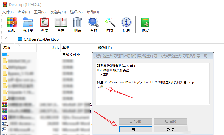现在开始修复压缩包文件,稍等片刻,修复完成,点击关闭,