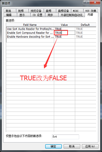 在首选项窗口中点击【内部】标签,可以看到很多的英文数据,在下方搜索框中输入So4,筛选出3个相匹配的数据,选择第二行数据,双击Value值,将TRUE改为FALSE,