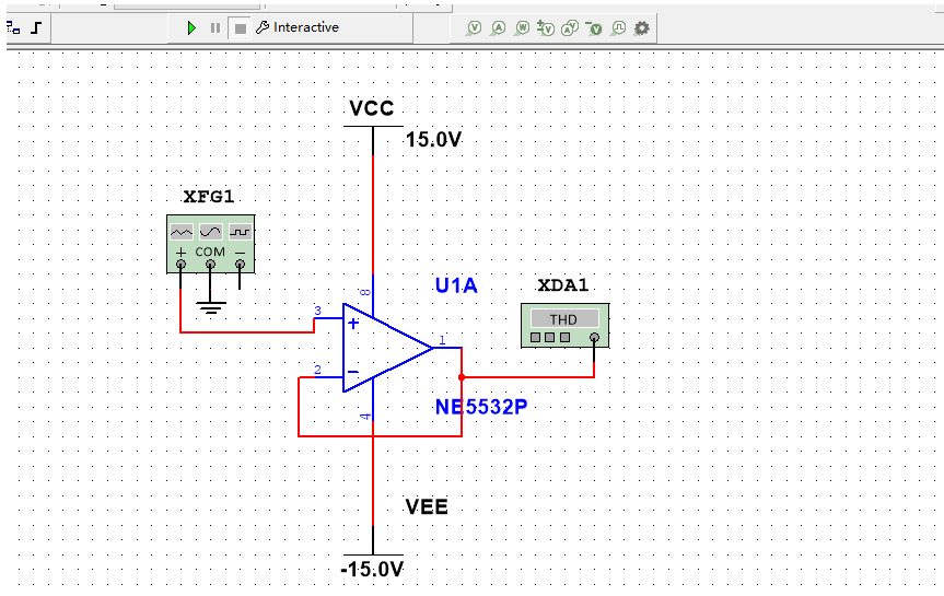 然后添加正负15v的电源,还有信号发生器,连接相应的线路,一个信号跟随器电路就制作完成了,