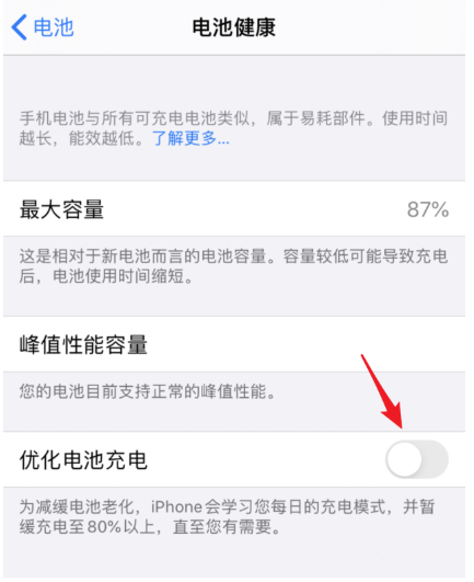 iOS13系统中加入了电池优化功能,建议开启这一功能。打开手机,进入设置界面,点击【电池】——【电池健康】——【优化电池充电】,开启电池优化功能。此外,如果你在外面不经常使用手机,可以打开低电量模式,保持电池的耐用度。