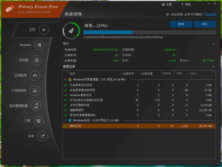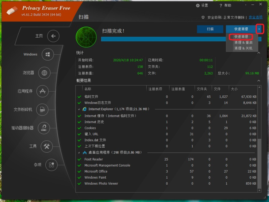 以上就是使用Privacy Eraser free清理电脑的一般操作。除此之外,用户还可直接点击【主页】选项中【快速清理】、【清理&重启】、【清理&关机】进行快捷清理。