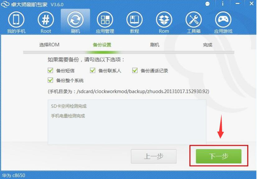 5、接下来,卓大师刷机专家会自动切换到“备份设置”界面,在此界面中,用户自行选择需要备份的资料,再点击右下角的“下一步”按钮。