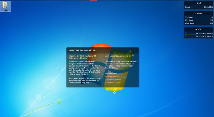 雨滴桌面Rainmeter在安装的时候要记得设置为开机启动,此外,在使用时,要先从网络上下载实现壁纸对应的插件。使用完后,会发现雨滴桌面Rainmeter做出来的桌面是动态的,非常酷炫。
