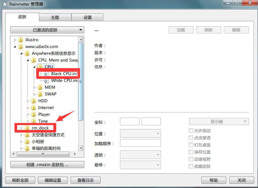 7、接着,再回到雨滴桌面Rainmeter的管理器界面,双击“rm dock”。