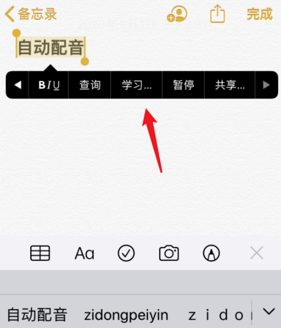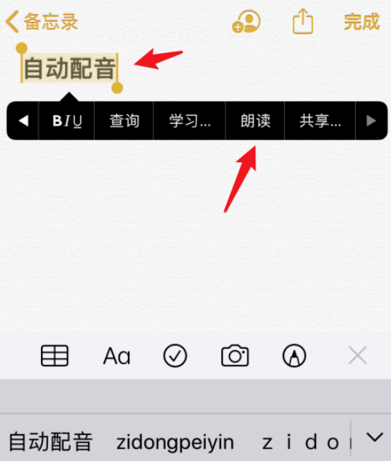 现在打开iPhone手机的备忘录,进入界面,点击右下方的【新建】按钮,如图,输入配音内容,选定文字并长按,出现选项,点击【朗读】,