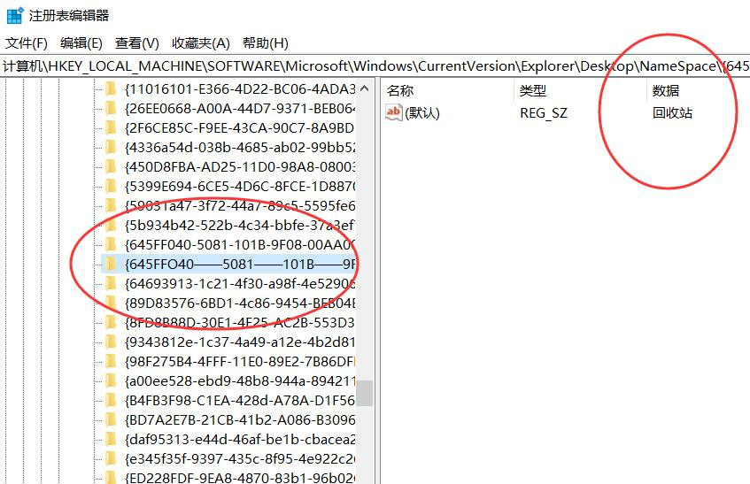 2、打开注册表,依次点击展开【HKEY_LOCAL_MACHINE\\SOFTWARE\\Microsoft\\Windows\\CurrentVersion\\Exp lorer\\Desktop\\NameSpace】,选中对应的NameSpace选项,右击选择新建” 项“ 文件, 将项值命名为” {645FFO40 — — 5081 — — 101B — — 9F08 — — 00AA002F954E}“。