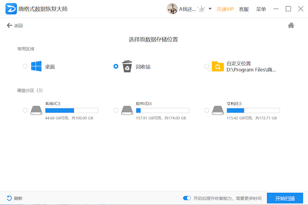 2、如图,选择原数据存储位置,此处文件所存储的位置可直接选择对应数据误删除的磁盘,点击下方【开始扫描】,软件即可对丢失数据的磁盘进行扫描,