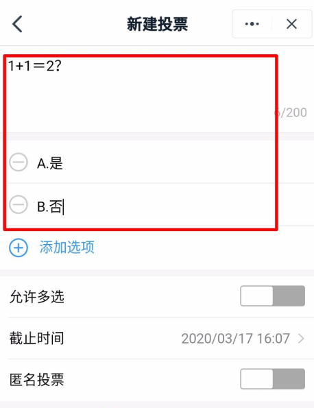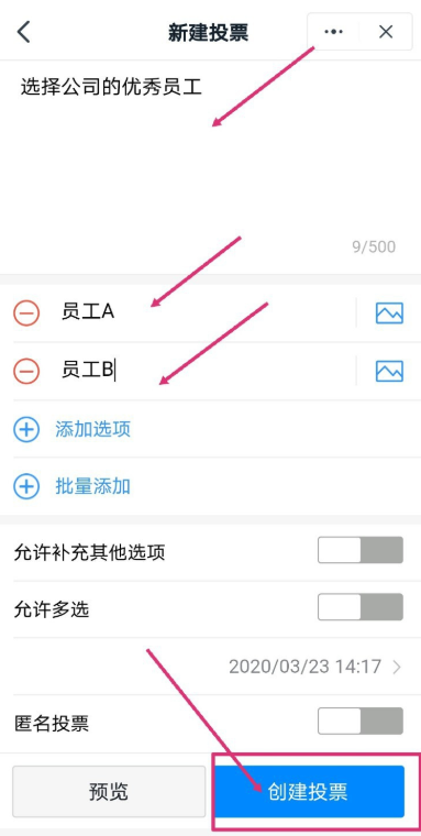 进入新建投票页面,输入投票内容,设置选项,点击【创建投票】,